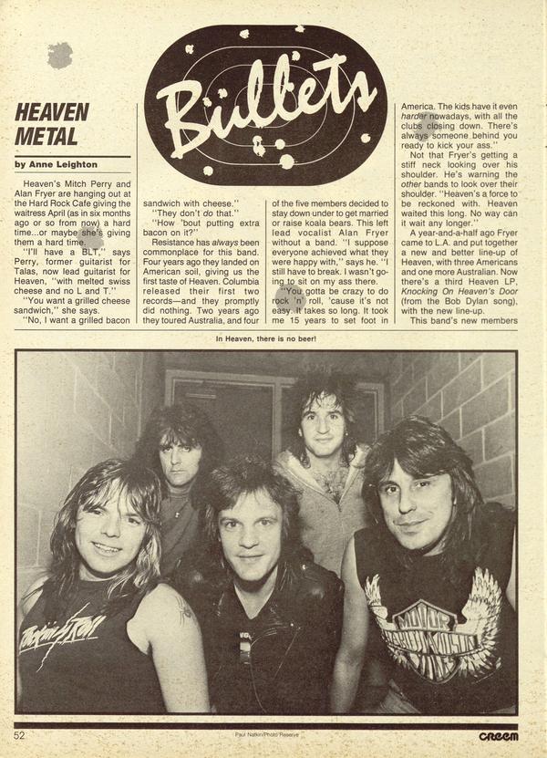 Heaven’s Mitch Perry and Alan Fryer are hanging out at the Hard Rock Cafe giving the waitress April (as in six months ago or so from now) a hard time...or maybe she’s giving them a hard time. “I’ll have a BLT,” says Perry, former guitarist for Talas, now lead guitarist for Heaven, “with melted swiss cheese and no L and T.”