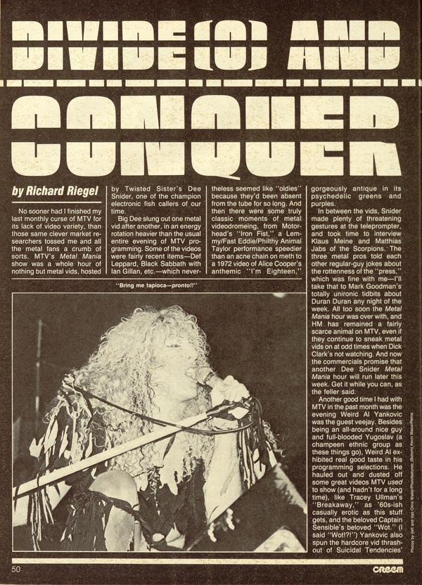 No sooner had I finished my last monthly curse of MTV for its lack of video variety, than those same clever market researchers tossed me and all the metal fans a crumb of sorts. MTV’s Metal Mania show was a whole hour of nothing but metal vids, hosted by Twisted Sister’s Dee Snider, one of the champion electronic fish callers of our time.