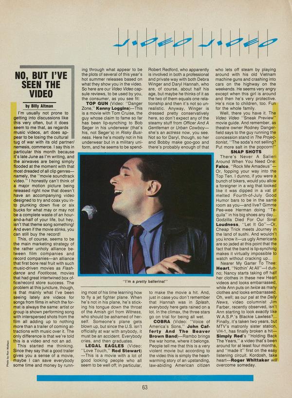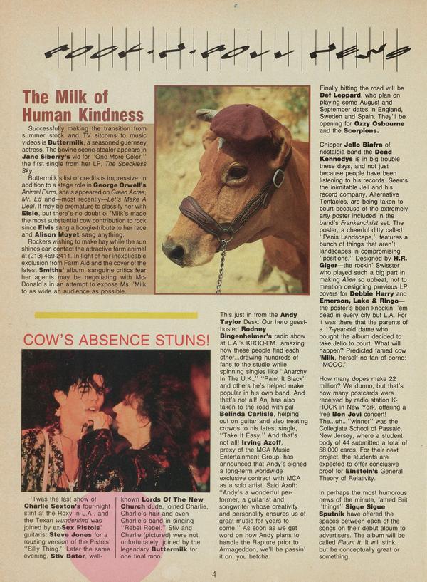Successfully making the transition from summer stock and TV sitcoms to music videos is Buttermilk, a seasoned guernsey actress. The bovine scene-stealer appears in Jane Siberry’s vid for “One More Color,” the first single from her LP, The Speckless Sky.