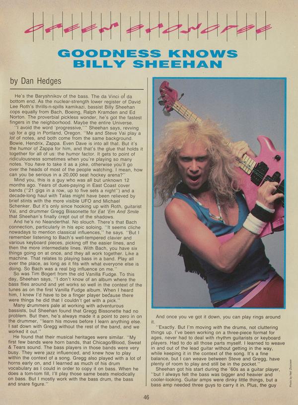 He’s the Baryshnikov of the bass. The da Vinci of da bottom end. As the nuclear-strength lower register of David Lee Roth’s thrills-n-spilis kamikazi, bassist Billy Sheehan cops equally from Bach, Boeing, Ralph Kramden and Ed Norton. The proverbial pickless wonder, he’s got the fastest fingers in the neighborhood.