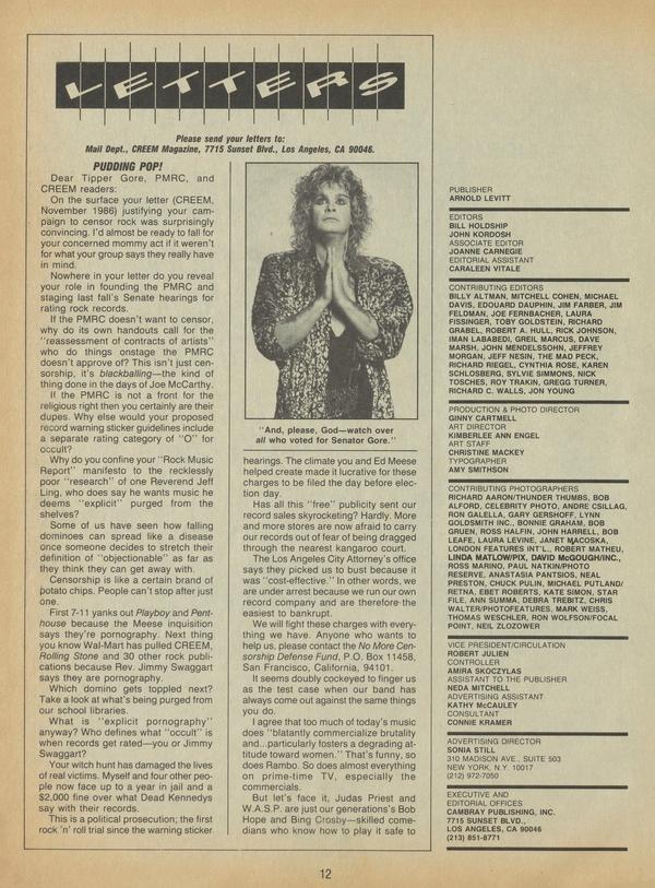 On the surface your letter (CREEM, November 1986) justifying your campaign to censor rock was surprisingly convincing. I’d almost be ready to fall for your concerned mommy act if it weren’t for what your group says they really have in mind.