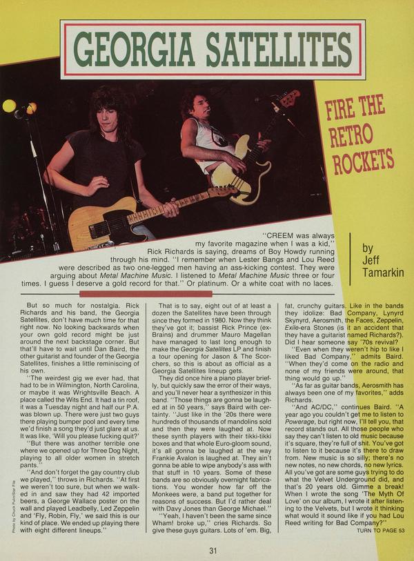 But so much for nostalgia. Rick Richards and his band, the Georgia Satellites, don’t have much time for that right now. No looking backwards when your own gold record might be just around the next backstage corner. But that’ll have to wait until Dan Baird, the other guitarist and founder of the Georgia Satellites, finishes a little reminiscing of his own.