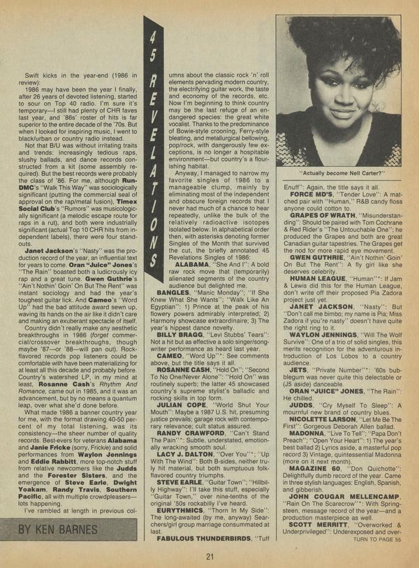 Swift kicks in the year-end (1986 in review): 1986 may have been the year I finally, after 26 years of devoted listening, started to sour on Top 40 radio. I’m sure it’s temporary—I still had plenty of CHR faves last year, and ’86s’ roster of hits is far superior to the entire decade of the 70s.
